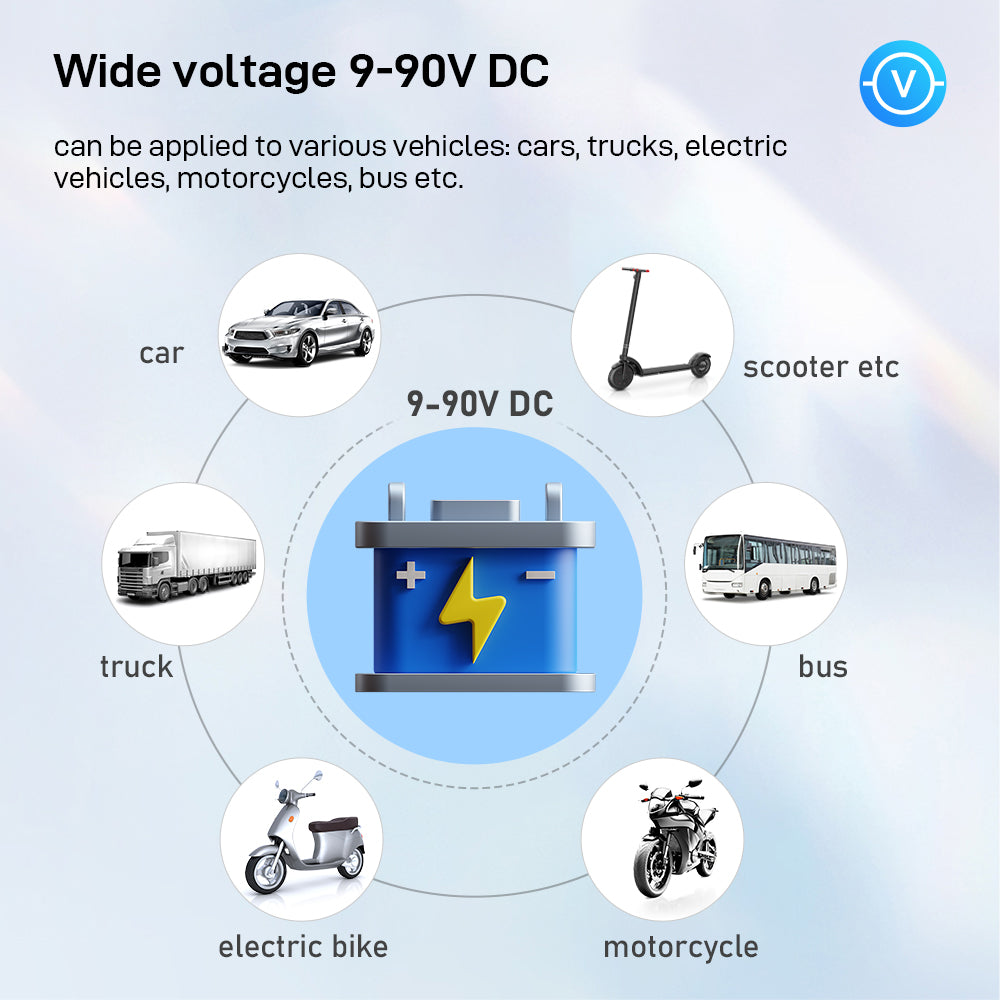 Wide voltage 9-90V DC, can be applied to various vehicles: cars, trucks, electric vehicles, motorcycles, bus etc.