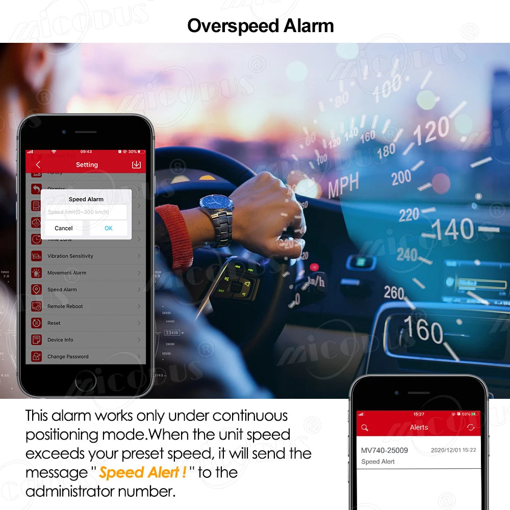 This alarm works only under continuous positioning mode.When the unit speed is exceed the speed you presetted, it will send message ldquospeed alarm!rdquo to the admin number every 5 minutes.
