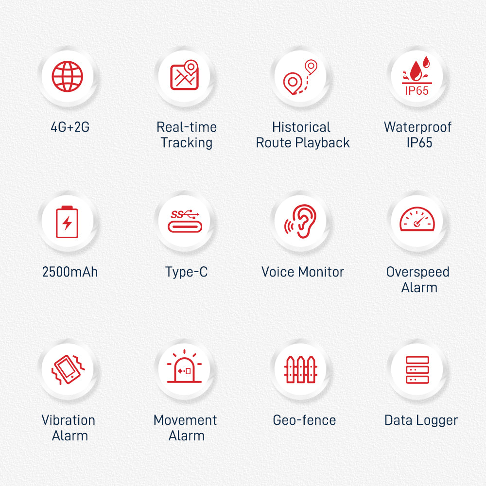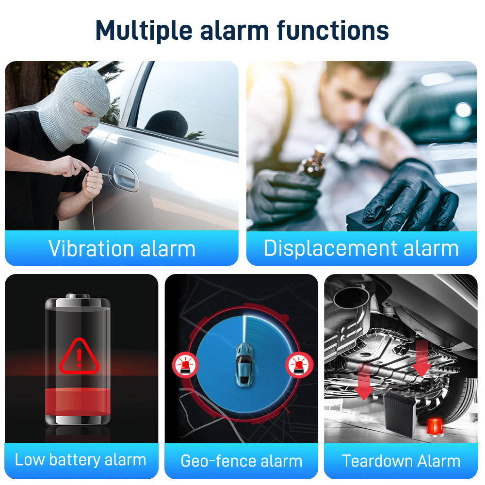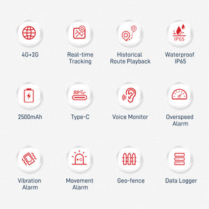 8. Multiple Alarms: Overspeed Alarm,Shock/Vibration Alarm, Movement Alarm, Geo-fence, Teardown Alarm.