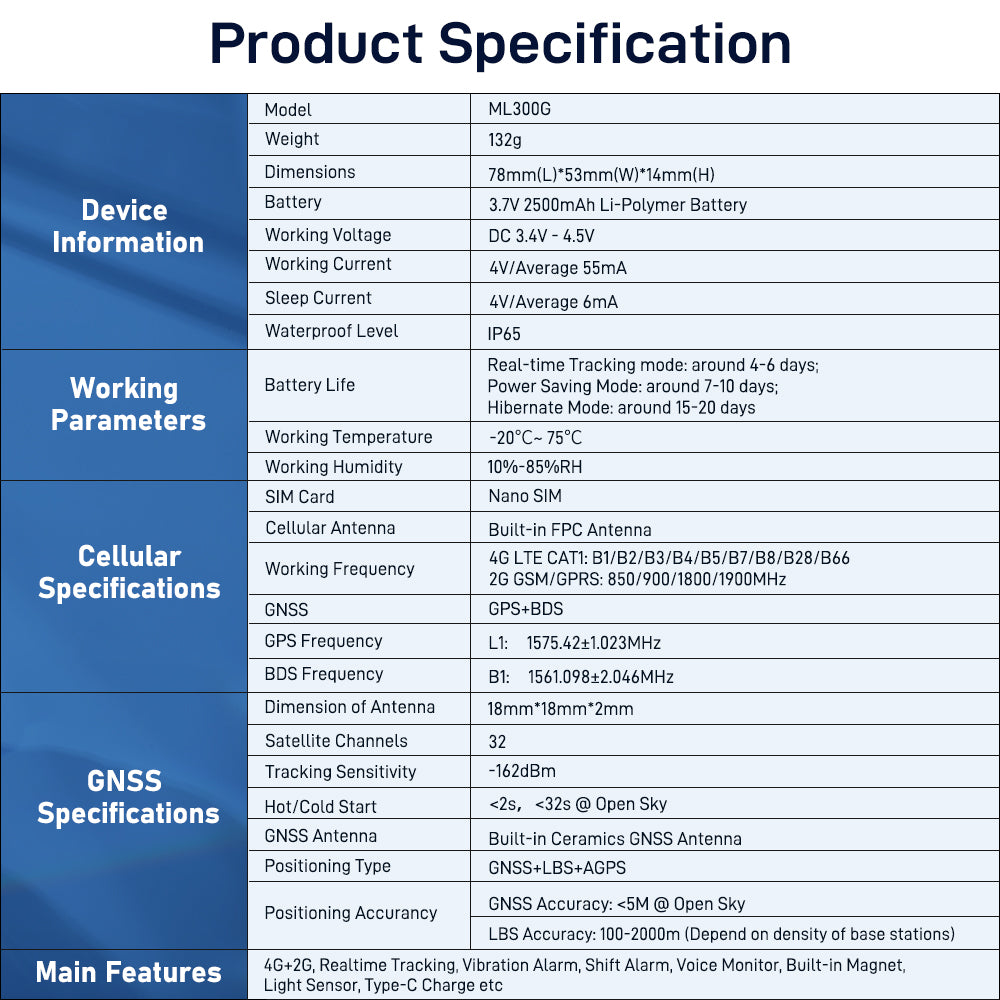 This GPS tracker ML300G supports the latest 4G network on multiple bands for operation globally and also stay with a fallback to 2G network, can work perfectly around the worldwide countries.