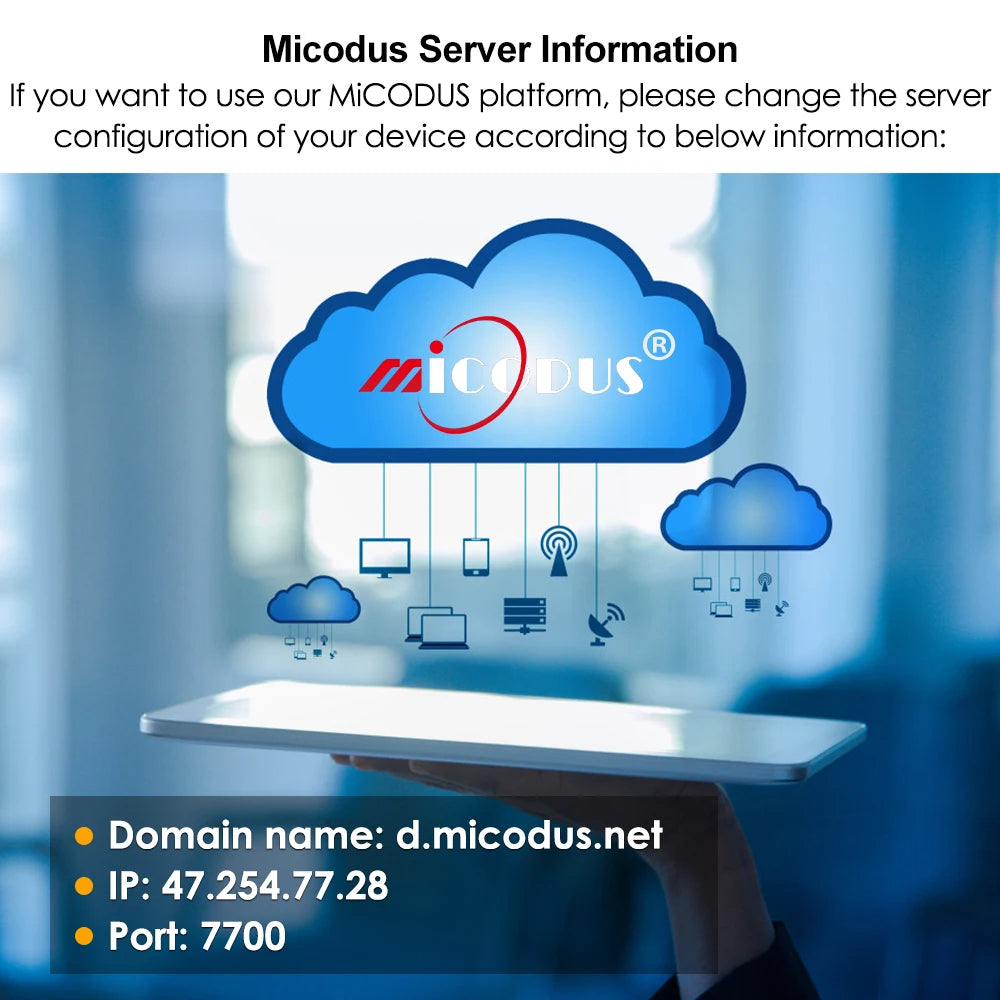 - Please following your device user guide to send sms command message to change IP and Port to MiCODUS: IP: 47.254.77.28; Port: 7700